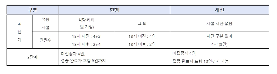 4단계 거리두기 지역은 시간에 관계없이 모든 다중 이용 시설등에서 미접종자 4인까지,