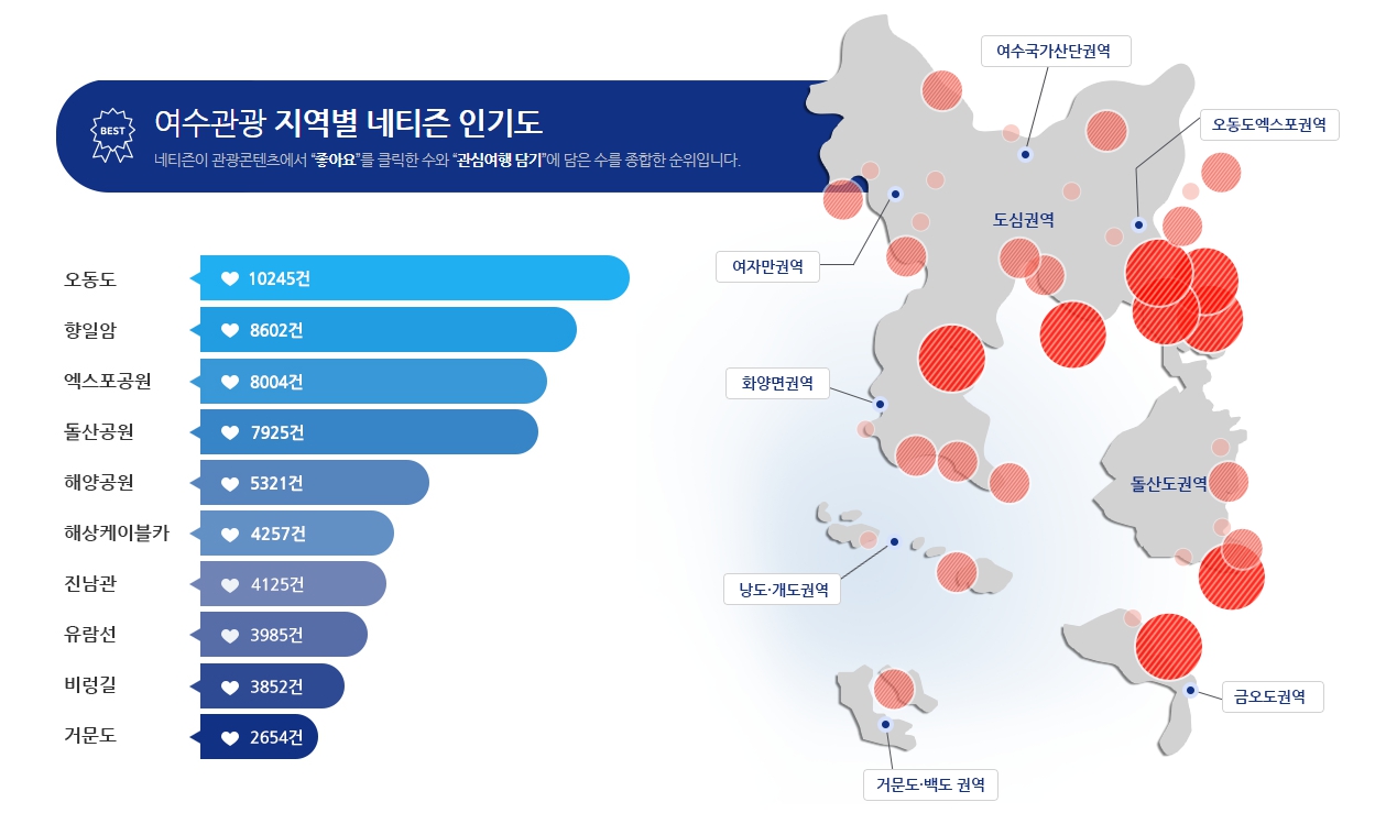 한폭의 그림처럼 어우러지며 섬자체가 하나의 동백꽃과 같은 오동도 섬으로 한국의 아름다운 백선에 선정되었다.
